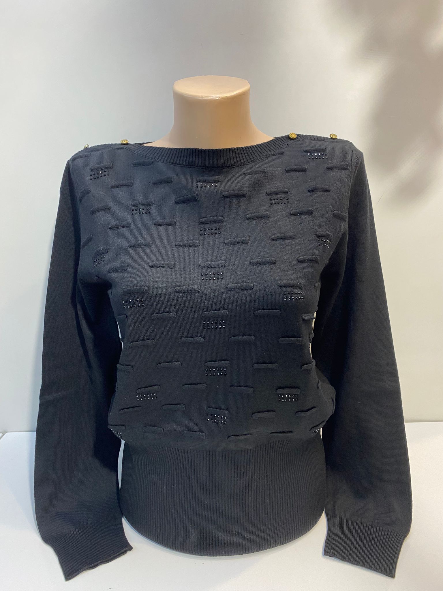Kayık yaka kabartmalı triko taş baskı omuz düğmeli hassas programda düşük devirde yıkanabilir S 38,40 bedenlere uyumlu