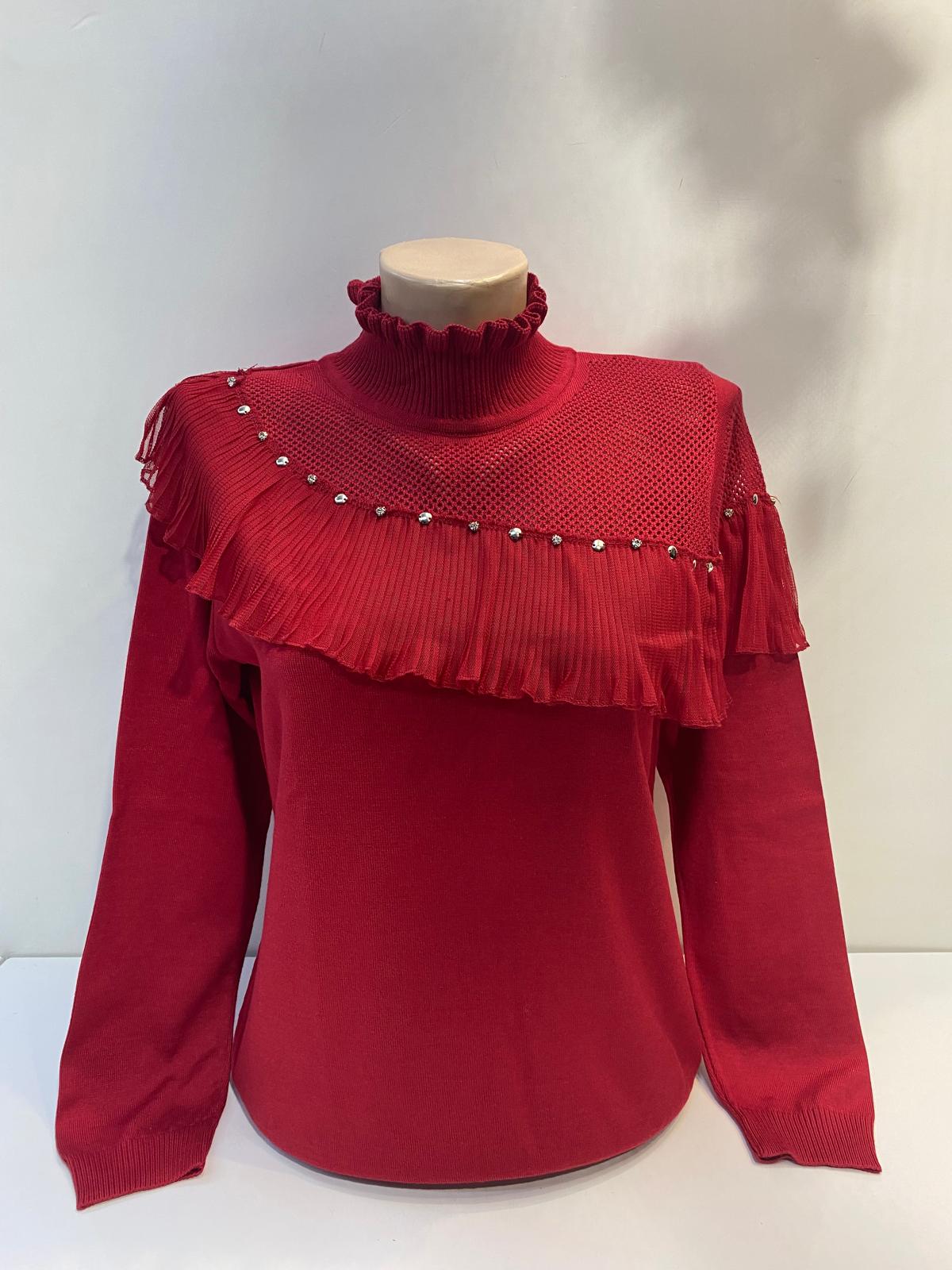 Yarım balıkçı yaka tül detay yaka detay triko kazak metal baskı hassas programda düşük devirde yıkanabilir iki renk mevcut